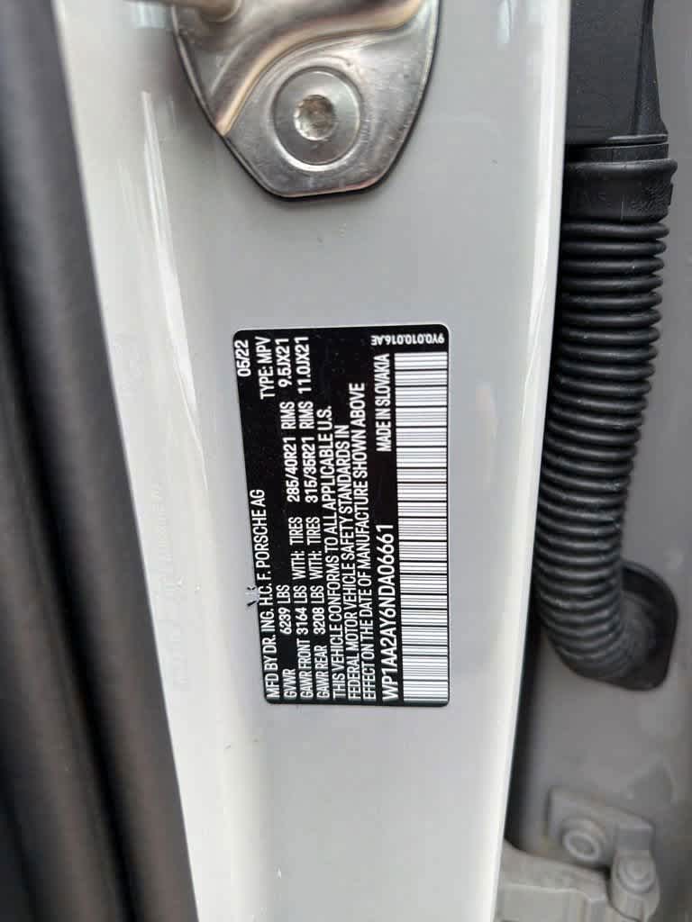 AM Interior in Black 3H ChalkPFF Premium Package PlusQ2J Power Seats (14-way) with Comfort Memory 4A4 Heated Seats (Front and Rear) 4D3 Ventilated Seats (Front) 9AE 4-Zone Climate Control 8IU LED-Matrix Design Headlights incl. Porsche Dynamic Light System Plus (PDLS+) 7Y1 Lane Change Assist (LCA) 3S2 Roof Rails in High Gloss Black 1D6 Trailer Hitch without Tow Ball43Q 21 Cayenne Exclusive Design Wheels in Satin Platinum incl. Wheel Arch Extensions in Exterior Color2ZH Heated Steering WheelKA6 Surround ViewPV2 Adaptive Cruise Control (ACC)