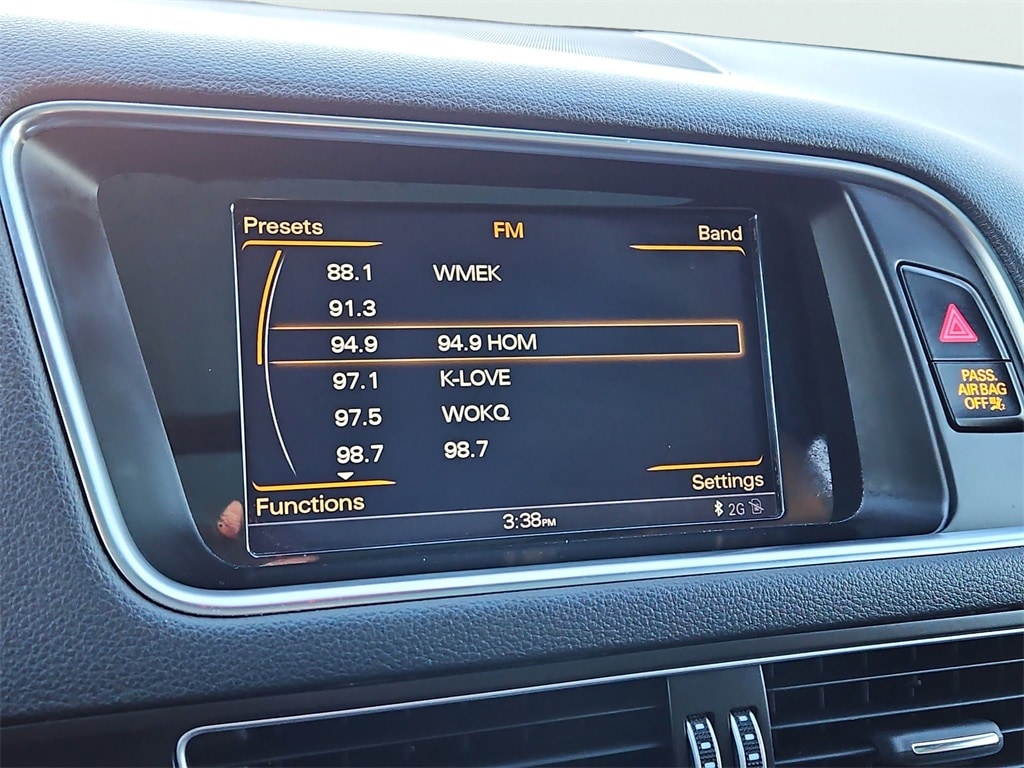 Leather, 10 Speakers, 4-Wheel Disc Brakes, ABS brakes, Air Conditioning, AM/FM radio, Auto-dimming door mirrors, Auto-dimming Rear-View mirror, Bumpers: body-color, CD player, Driver vanity mirror, Dual front impact airbags, Dual front side impact airbags, Four wheel independent suspension, Front anti-roll bar, Front Center Armrest, Front fog lights, Garage door transmitter: HomeLink, Genuine wood console insert, Genuine wood door panel insert, Headlight cleaning, Heated door mirrors, Heated front seats, High intensity discharge headlights: Xenon plus, Leather Seating Surfaces, Leather Shift Knob, Leather steering wheel, Memory seat, Occupant sensing airbag, Outside temperature display, Overhead airbag, Overhead console, Power door mirrors, Power driver seat, Power Front Heated Bucket Seats, Power Liftgate, Power moonroof, Power passenger seat, Power steering, Power windows, Radio data system, Radio: MMI Plus System w/6.5" Color Screen, Rain sensing wipers, Rear seat center armrest, Rear window wiper, Remote keyless entry, Security system, Speed-sensing steering, Speed-Sensitive Wipers, Steering wheel mounted audio controls, Telescoping steering wheel, Tilt steering wheel, Traction control, Variably intermittent wipers, Wheels: 8.0" x 19" 5-Arm Star Design.